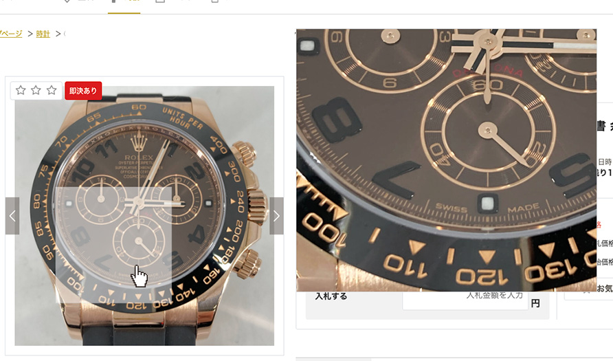 商品画像にカーソルを合わせると、矢印が指マークに変わります。クリックすると画像が拡大され、細かな状態までご確認いただけます。