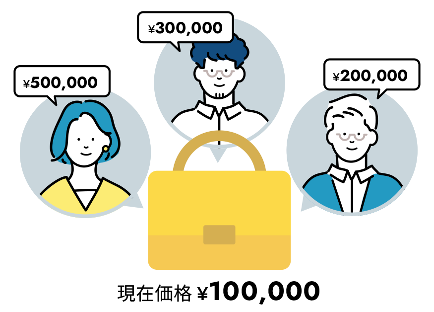 入札開始価格から最低上乗せ金額以上の入札ができ、他の入札者が価格を上乗せしていくことで、最も高い価格を提示した方が落札権を得ます。