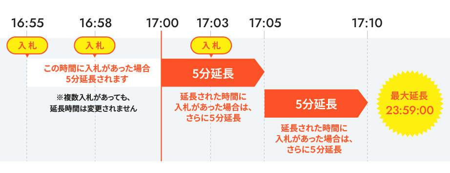 オークションの入札締切時間は通常17:00ですが、入札締切5分前に入札された場合は、締切時間が延長されます。延長ルールは以下の通りです。